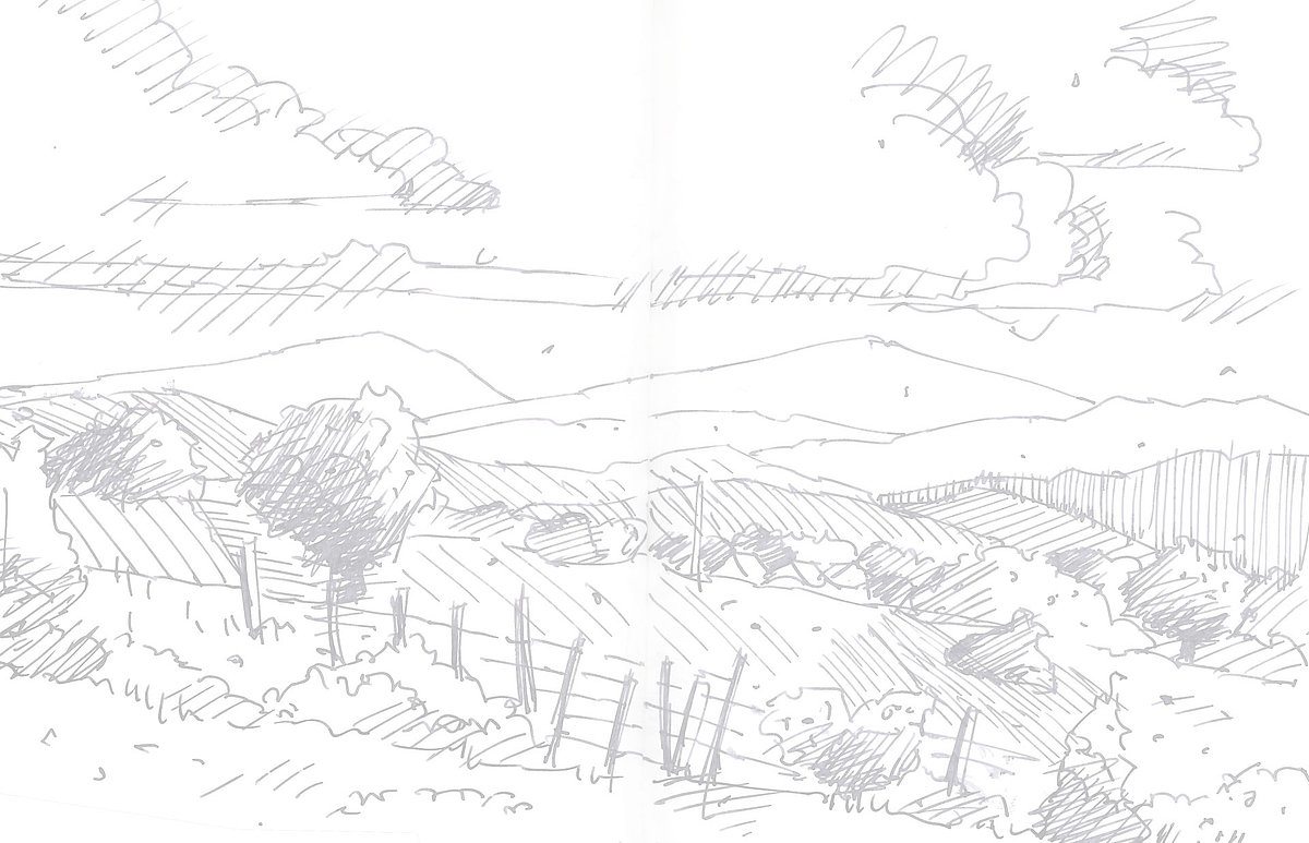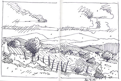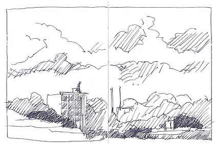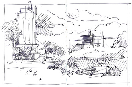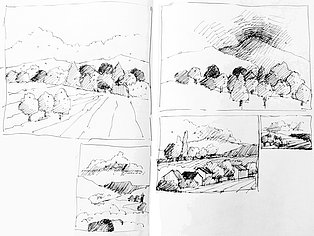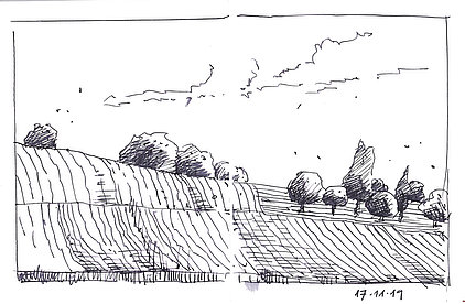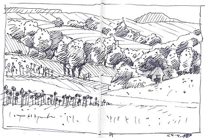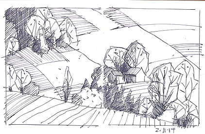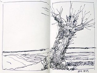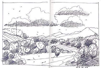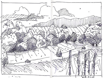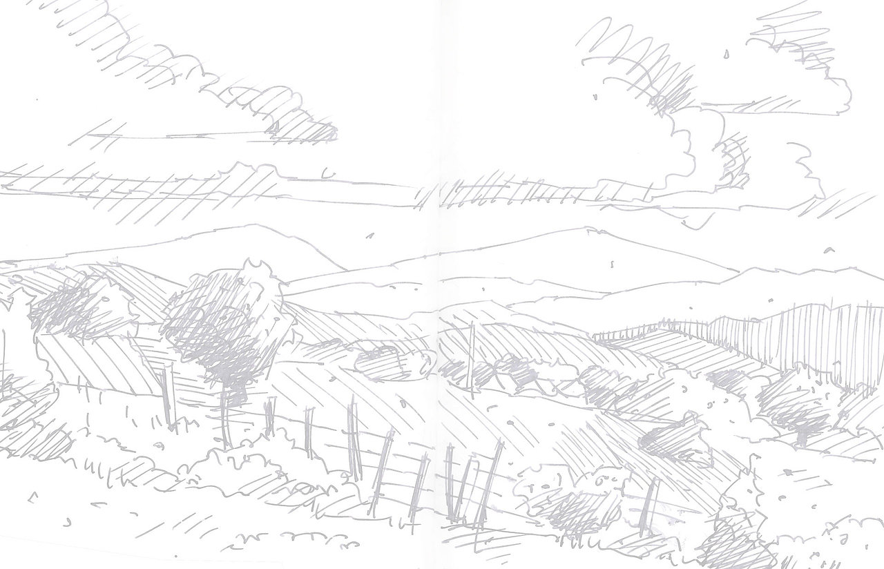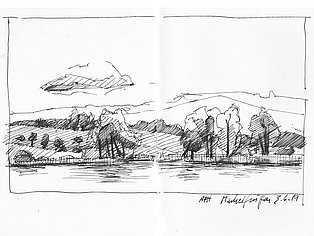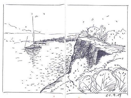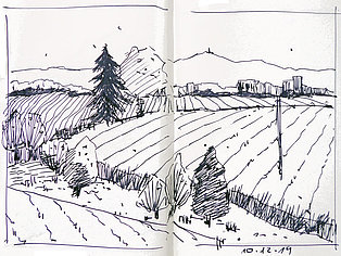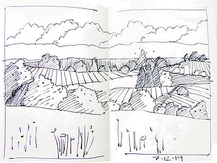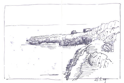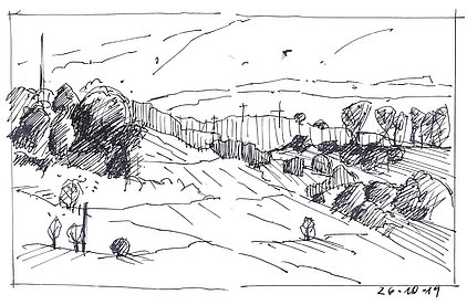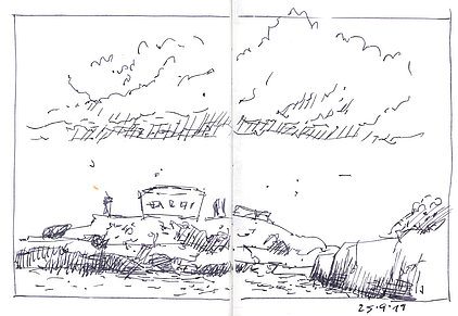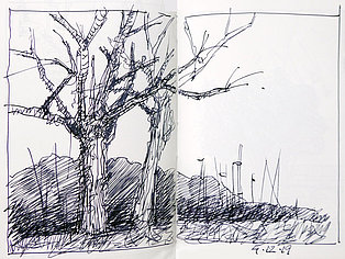 Die Skizzenbücher 22 bis 29 (in Auszügen) der Jahre 2018 – 2020 enthalten zeichnerische Begegnungen mit Illustrationsstilen anderer Zeichner. Beeindruckt durch vor allem die englischen und schottischen Zeichner Ian Mcque, Ian Sideaway u. a., deren Zeichentechnik mich beeindruckte, wandelte sich mein eigenes Zeichnen. Stark war die Spur durch Ian Mcque’s Zeichenart, die eine klare, konturierte Zeichnung ergaben, ergänzt durch kleine Strukturen und Kringel, die eine Darstellung „erzählerisch“, lebendig werden ließ. Bei Ian Sideaway waren es die eigentümlichen Schraffuren, mit denen ich etwas experimentierte.