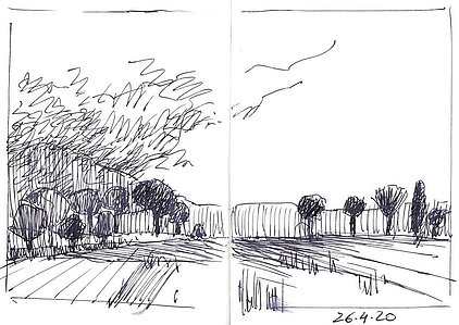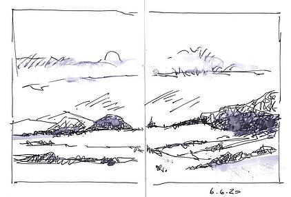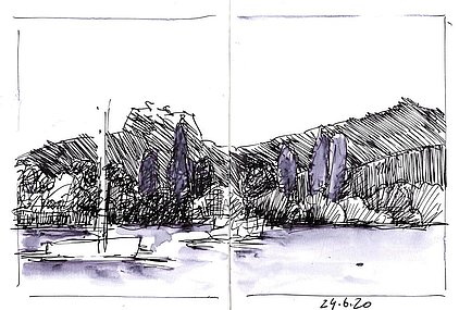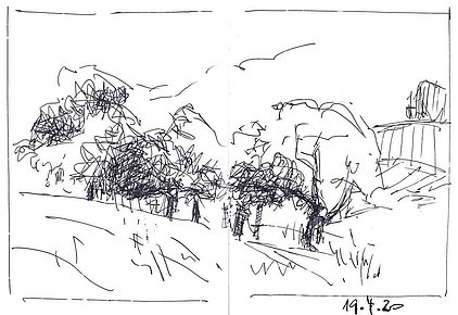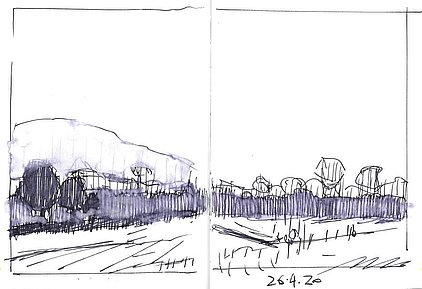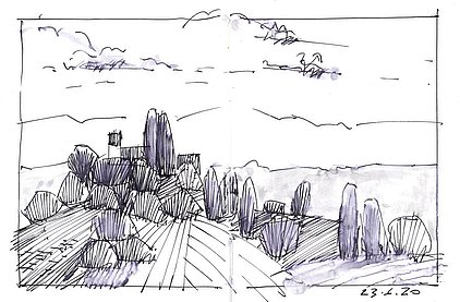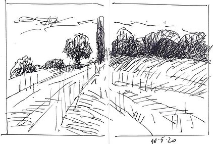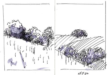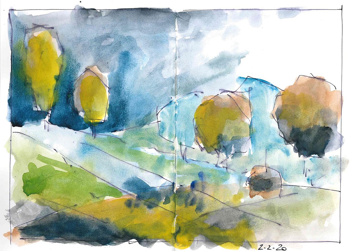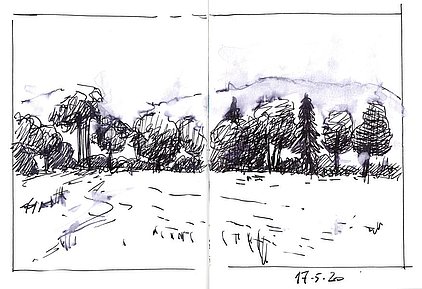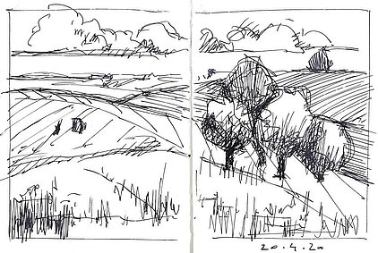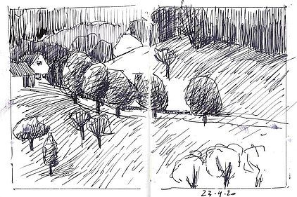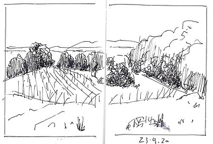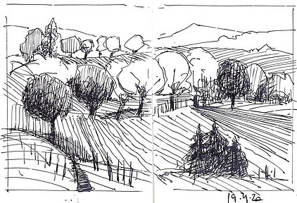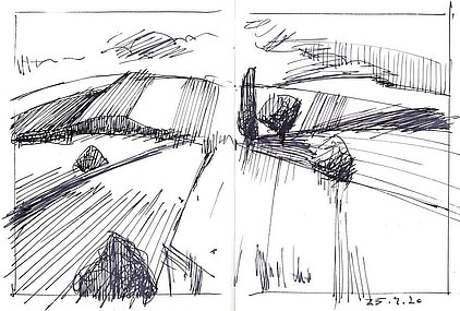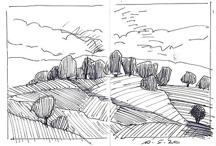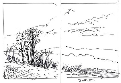 Skizzenbuch 32 (Format 16 x 11,5 cm, hoch), 23.2.2020-10.11.2021, rund hundert überwiegend schwarz-weiß-Zeichnungen von Landschaftssichten mit schwarzer Tinte (Füller), gelegentlichen Verwischungen (lavieren) mit Wasser oder seltener mit Farbe.