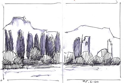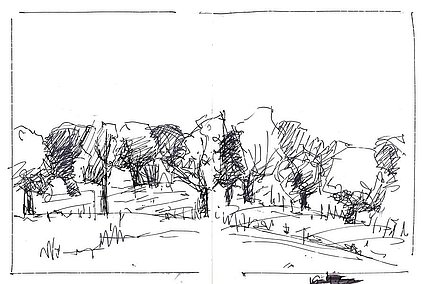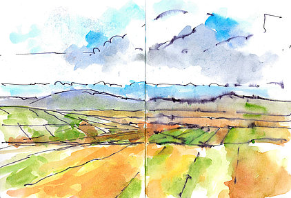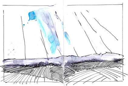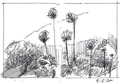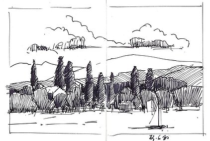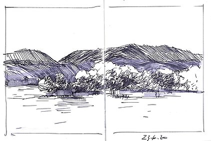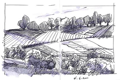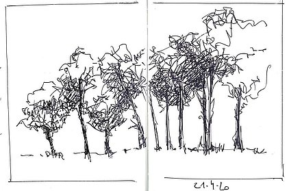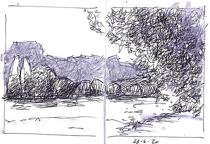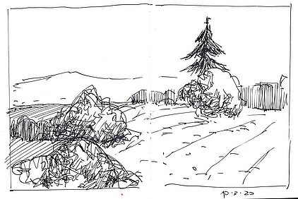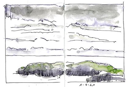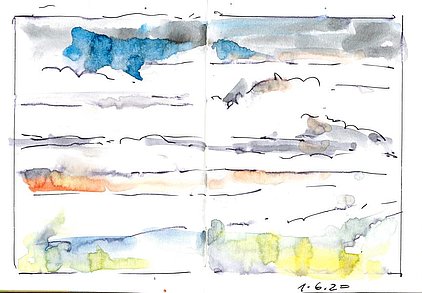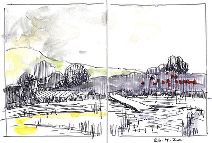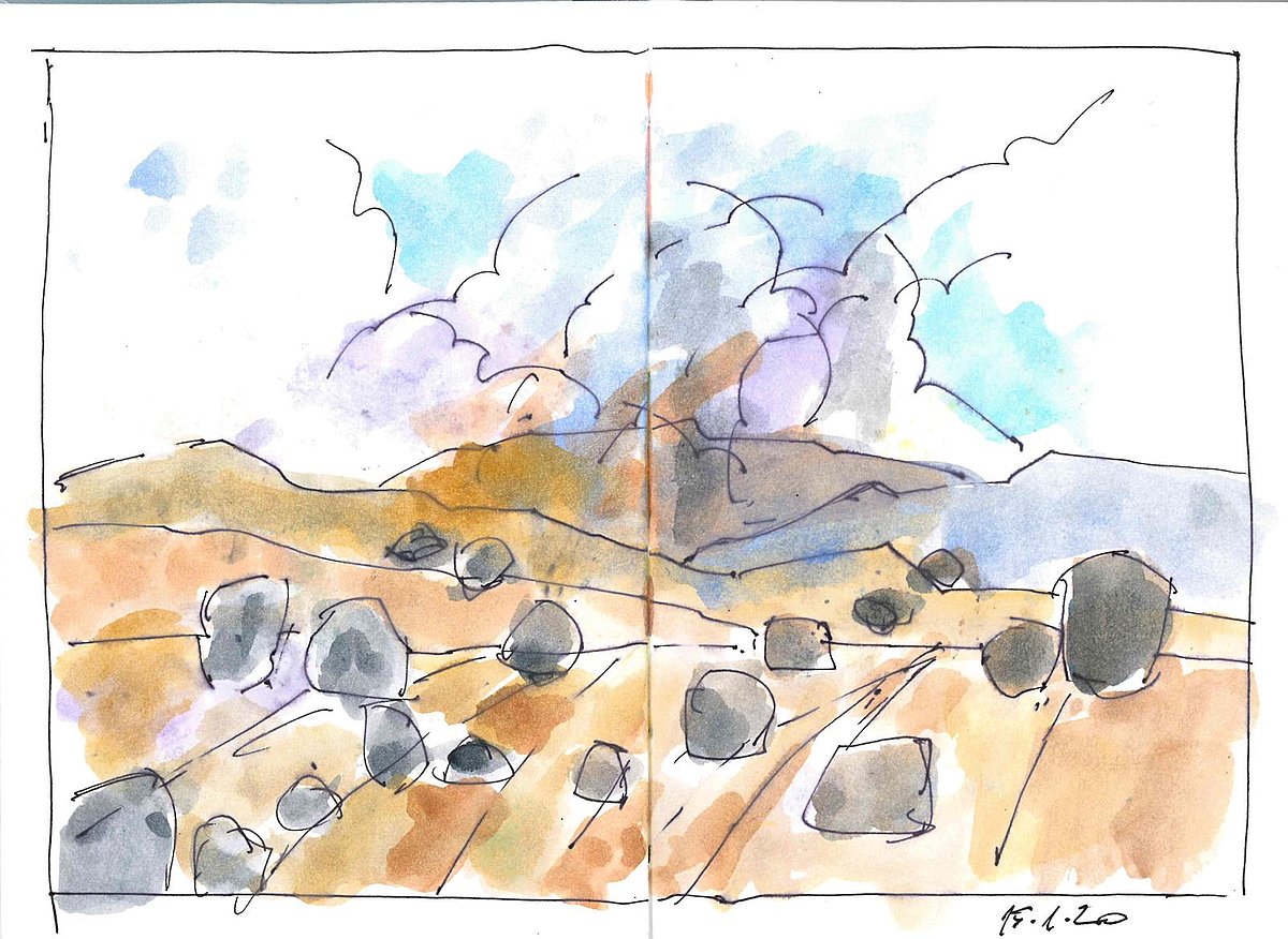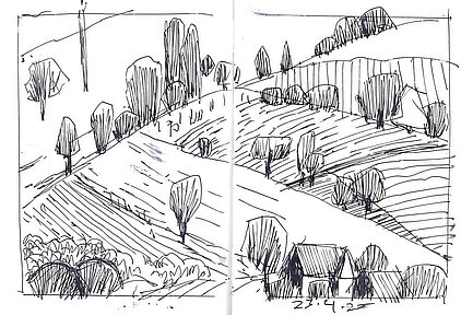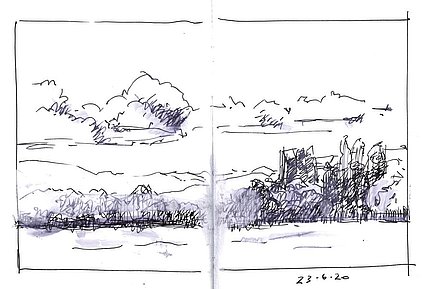 Skizzenbuch 32 (Format 16 x 11,5 cm, hoch), 23.2.2020-10.11.2021, rund hundert überwiegend schwarz-weiß-Zeichnungen von Landschaftssichten mit schwarzer Tinte (Füller), gelegentlichen Verwischungen (lavieren) mit Wasser oder seltener mit Farbe.