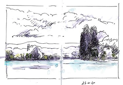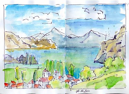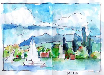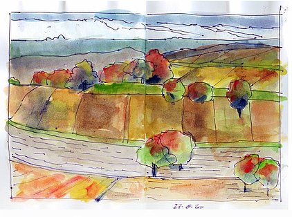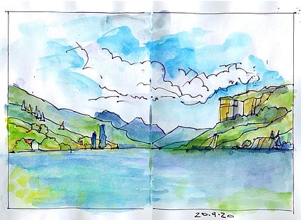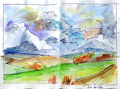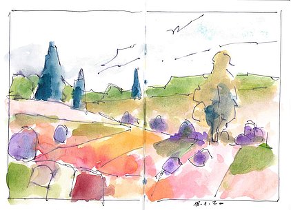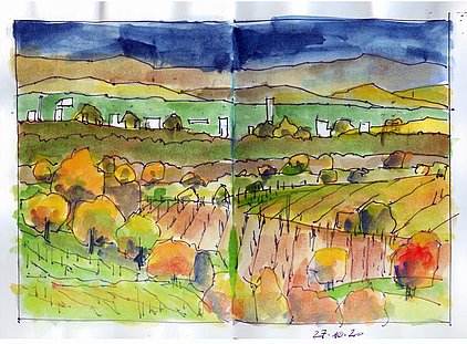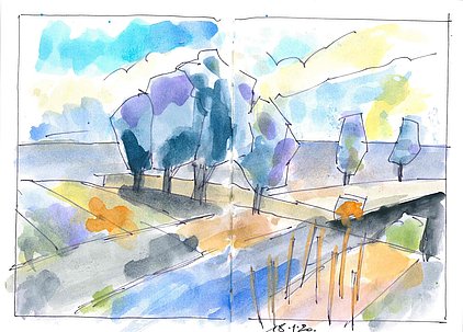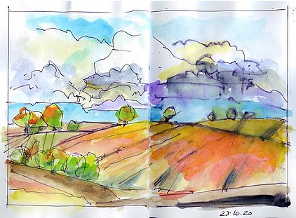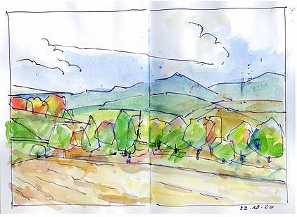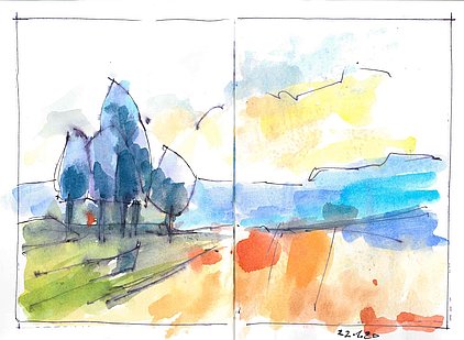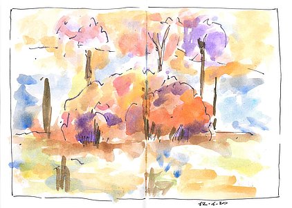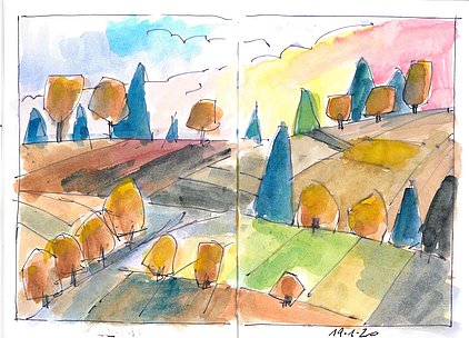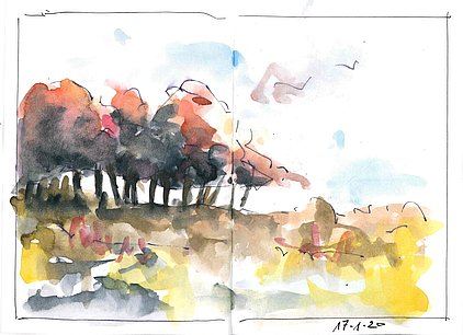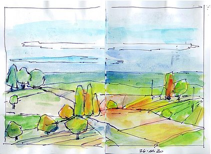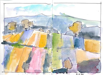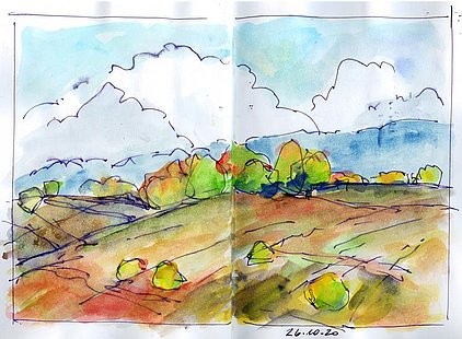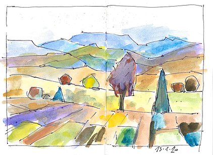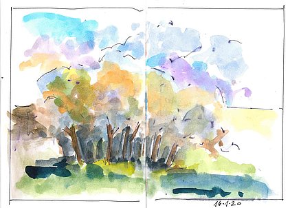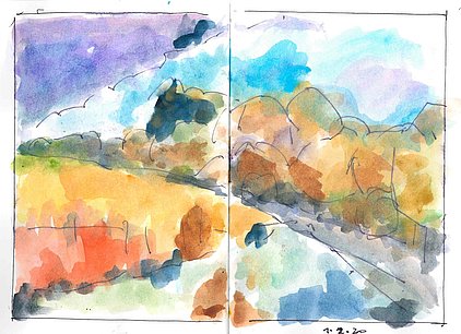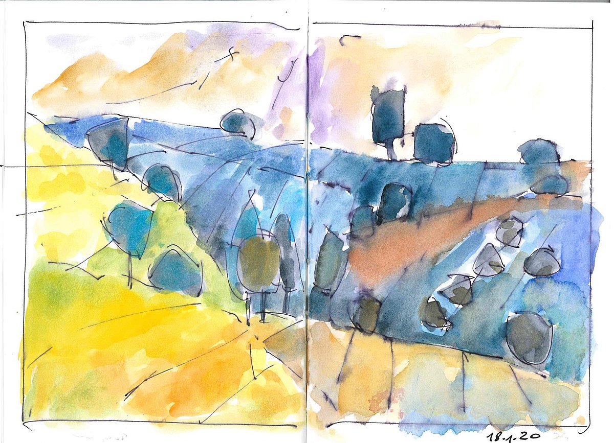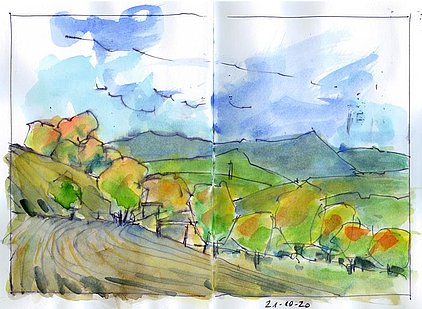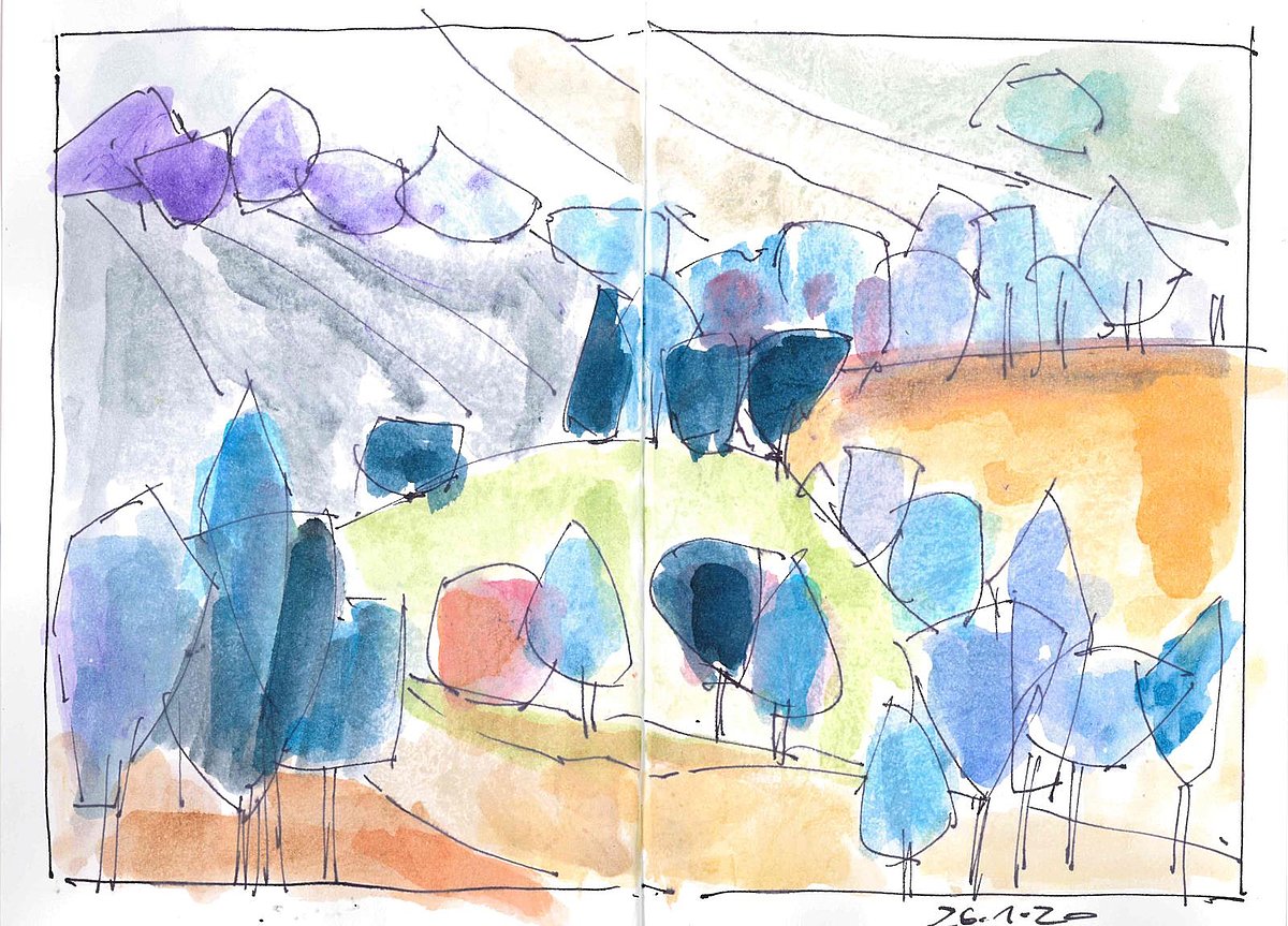 Skizzenbuch 31 (Format 20,5 x 14 cm, hoch), 6.1.-27.10.2020, entstand unterwegs, mal Bodensee, Walensee (CH), Rebenlagen, Baumgruppen, Rheinebene usw. in schnellen Konturzeichnungen und farbiger Übermalung (Aquarell). Experimentieren mit bunten Farbtönen zu einem Zeitpunkt, wo grau-braune Farben in der Natur vorherrschen, fällt unter gestalterische Freiheiten, um interessante, lebendige Bilder zu erzeugen.