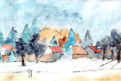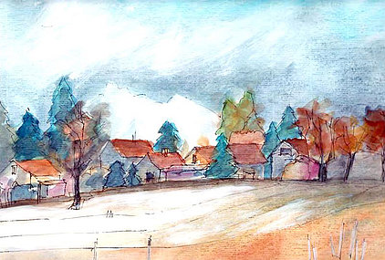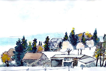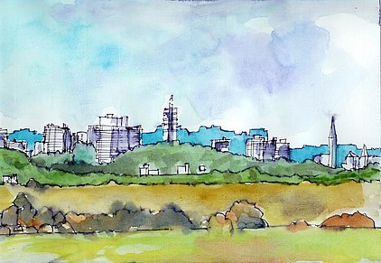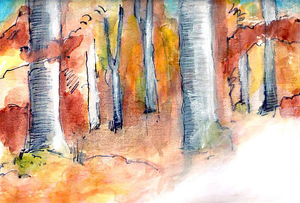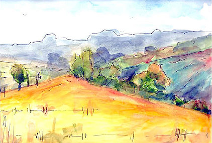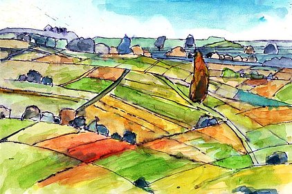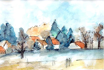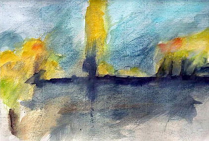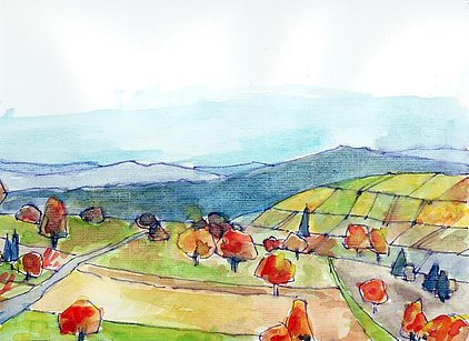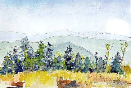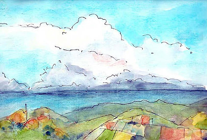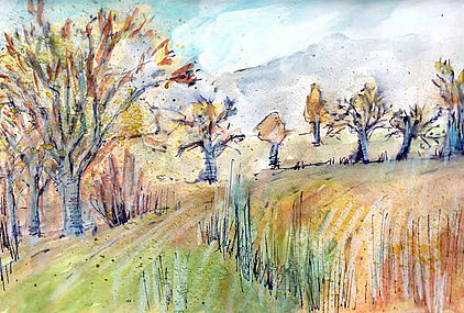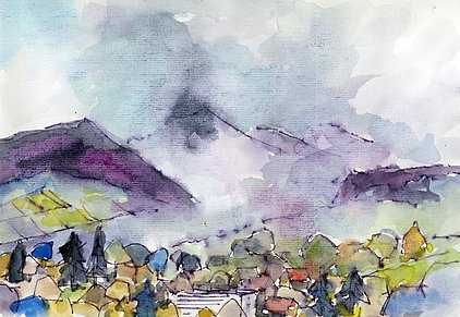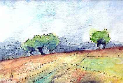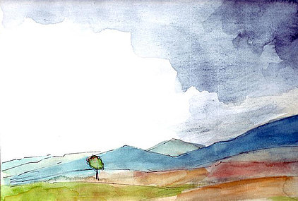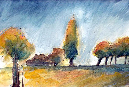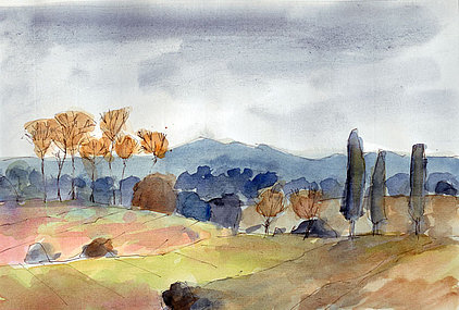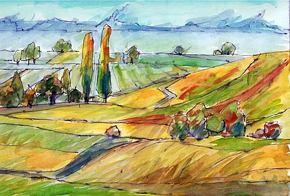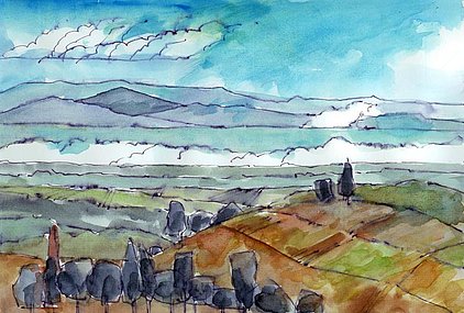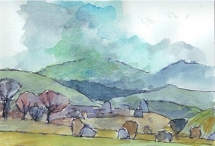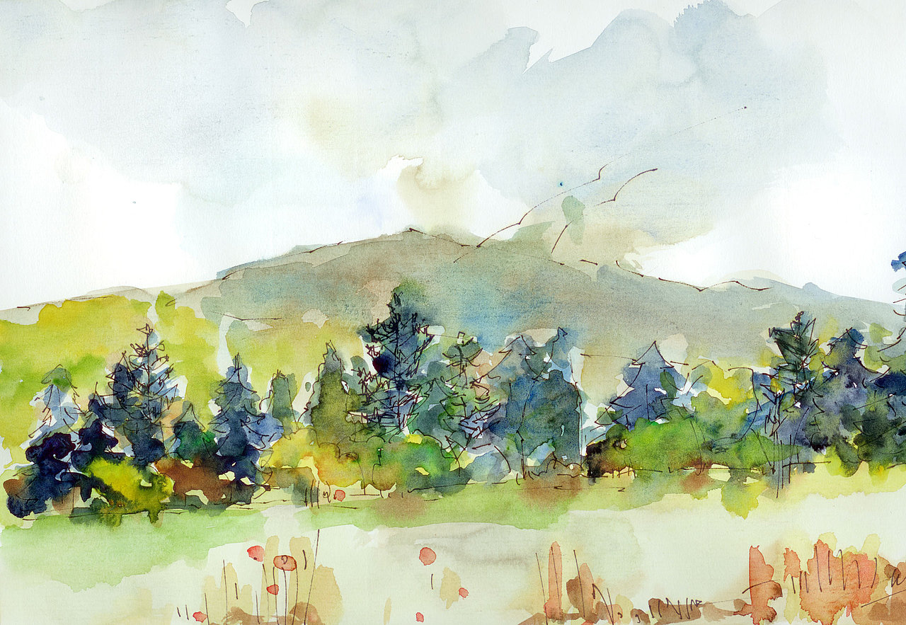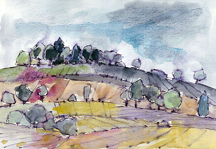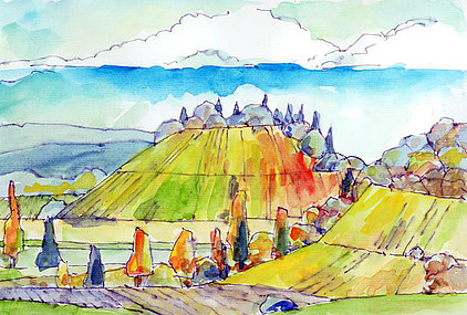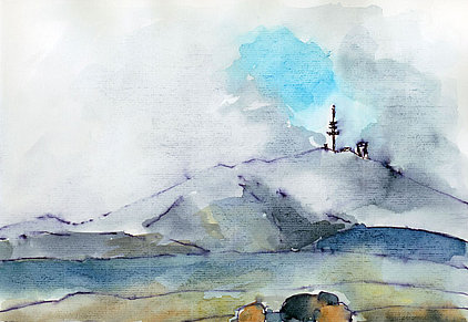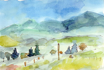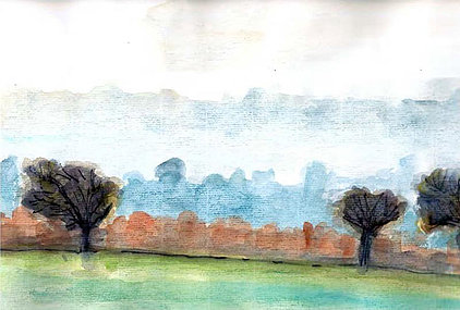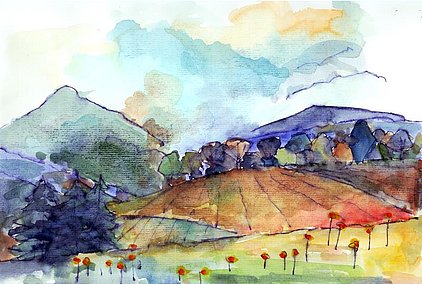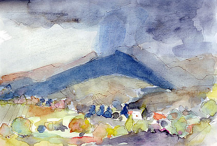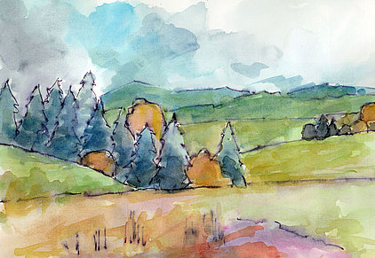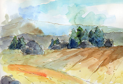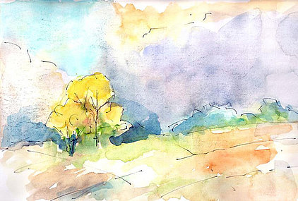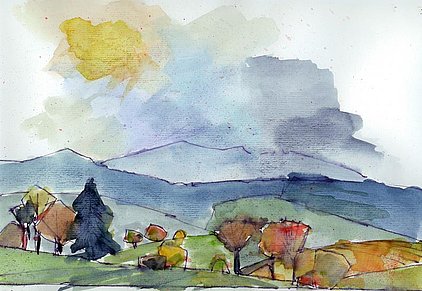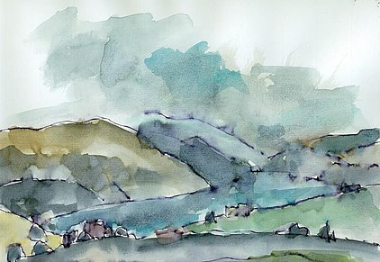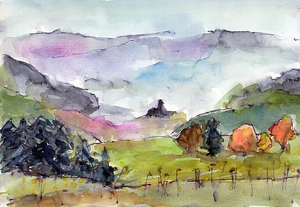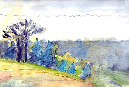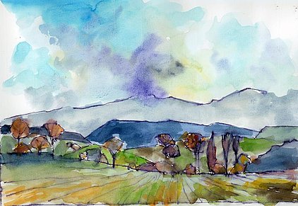 Skizzenbuch 34 (Format 35 x 25 cm, quer) enthält im ersten Drittel Landschaftsdarstellungen mit Aquarell und verwaschenen Tintenstrukturen. Ab Januar 2021 ersetzte ich Tinte durch Fineliner. Diese dünnen, wasserunlöslichen Linien gaben den wenig konturierten Farbflächen eine gegenständliche Zuordnung, begrenzten auf eine wiedererkennbare Form.