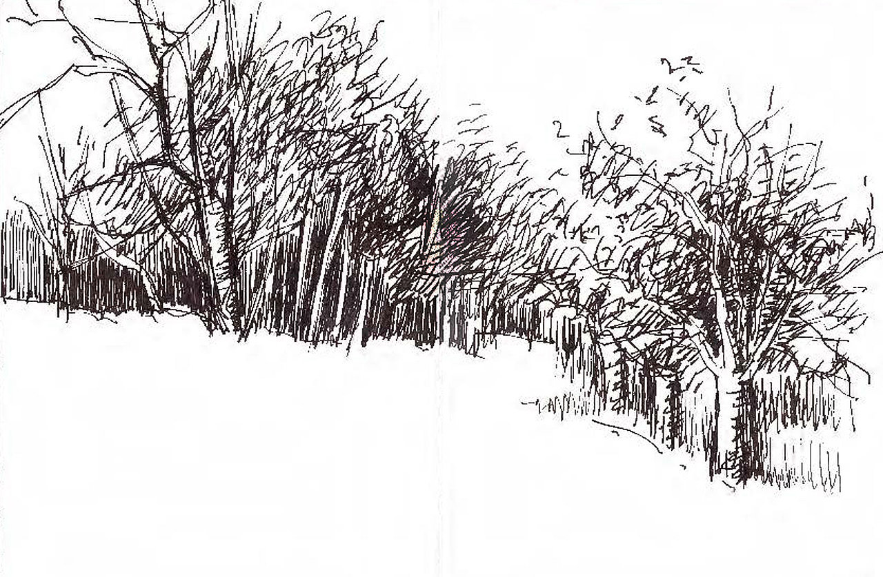 Skizzenbuch 35 (Format 16 x 11,5 cm, hoch) umfasst Schwarz-Weiß-Zeichnungen von Anfang November 2021 bis Ende Januar 2022, gezeichnet mit Fine-Liner 0,3 und 0,5 mm Strichstärke. Schwarz-Weiß-Zeichnungen versuchen Form- und Lichtverhältnisse, Strukturen und Materialoberflächen mit stark reduzierten Mitteln darzustellen.