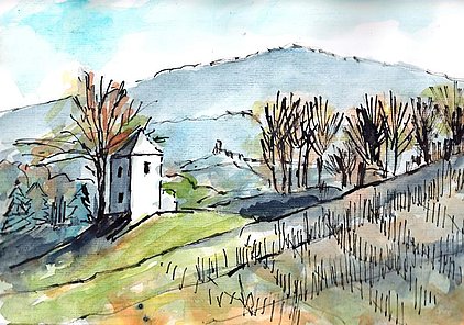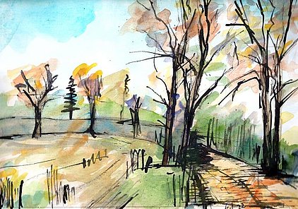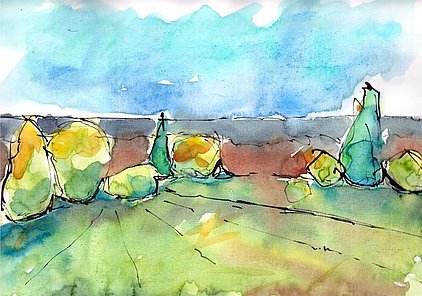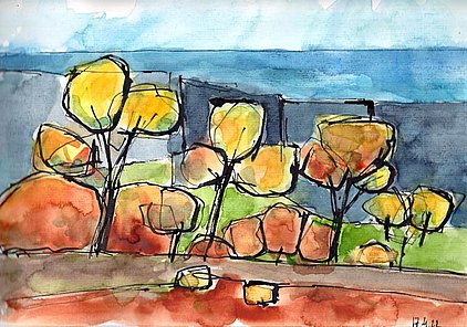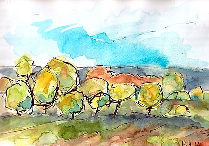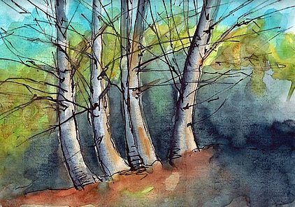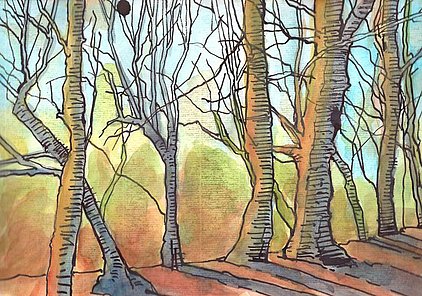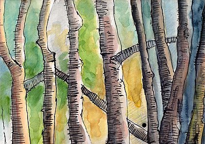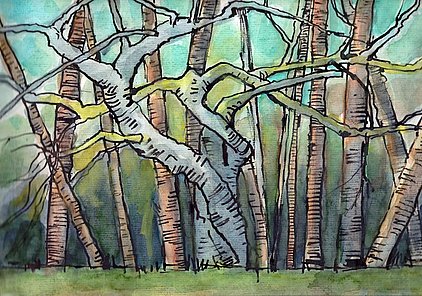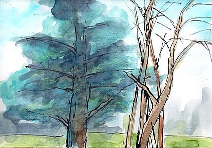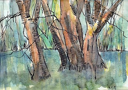Die zwischen Papier und Zeichenmaterialien bestehenden Abhängigkeiten flossen ein, die Unberechenbarkeiten von farbigen Tinten, Wasser und Aquarellfarbe, verwischenden Farbstiften und ineinander fließenden Farbbächen, das "Prozesshafte" stand im Vordergrund. Die Baumgruppen, Kronen, Astabgänge u. ä. bildeten eine Art Vorlage und zugleich Material zur Betrachtung über die wunderbare Statik gewachsenen Holzes, die Charakteristik der einzelnen Baumformen bar jeder Blätter. Die farbliche Gesamtstimmung der jeweiligen Orte mit den diffusen Hintergründen der Wintermonate, der allmähliche Übergang ins Frühjahr, die farblichen Veränderungen in den letzten Märztagen und der Druchbruch frischen Grüns im April, beeinflussten die Farbpalette unweigerlich.
