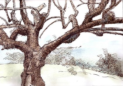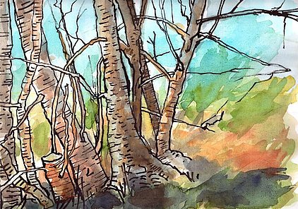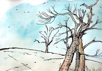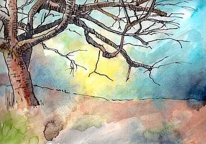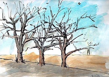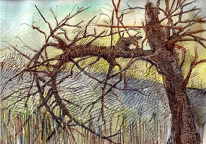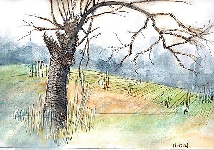 Skizzenbuch 36 (Format 36,5 x 25 cm, quer, Maschinenbütten), 13.12.2021. Materialmix aus Tinten, Ausziehtusche, Aquarellfarbe und Buntstiften, Rohrfedern aus Schilf, Stahlfedern und Finelinern. Den Winter über zeichnete, illustrierte, colorierte ich Baumskelette und probierte vor allem anderem Zeichenmaterialien aus.